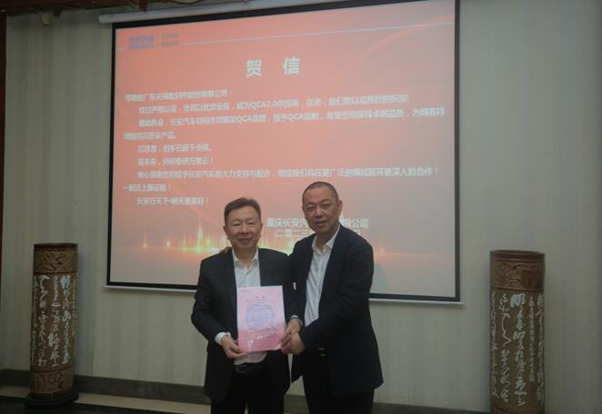 上午9:30交流會(huì)正式開始,會(huì)上,長安汽車總工程師王波先生向天誠公司頒發(fā)了QCA賀信并對(duì)天誠公司發(fā)展表示肯定與勉勵(lì)。